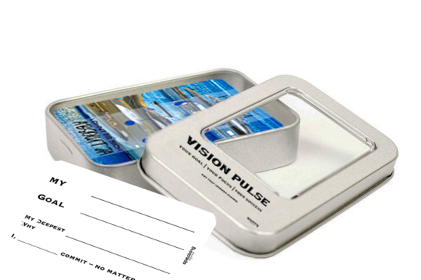 The Vision Pulse cards are compact impulse tools that help your customers define their goals and stay focused. The set includes 6 double-sided cards with different motifs. Each card provides space for a personal goal, the “why” behind it, and a target date.