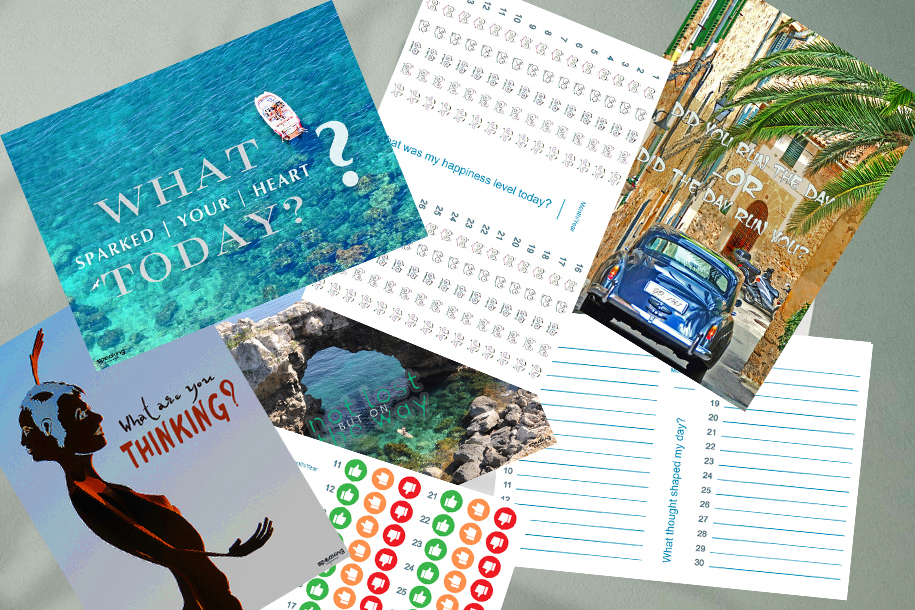 The Mood Compass set contains 5 double-sided cards that combine central reflection questions with strong motifs. Each card has space on the back to record thoughts or check answers.