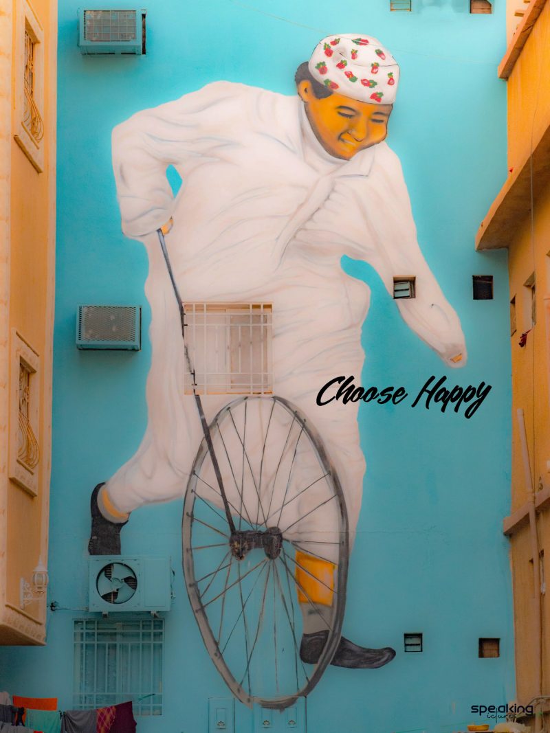Considered to be the birthplace of the nation, Ad Diriyah is the original home to the House of Saud and the historical centre, the site of At-Turaif, a designated UNESCO World Heritage Site since 2021. In the neighbourhood, on a narrow street, I found this young boy’s brilliantly done street art. It brought back childhood memories and reminded me that happiness is our natural state and doesn’t need much.