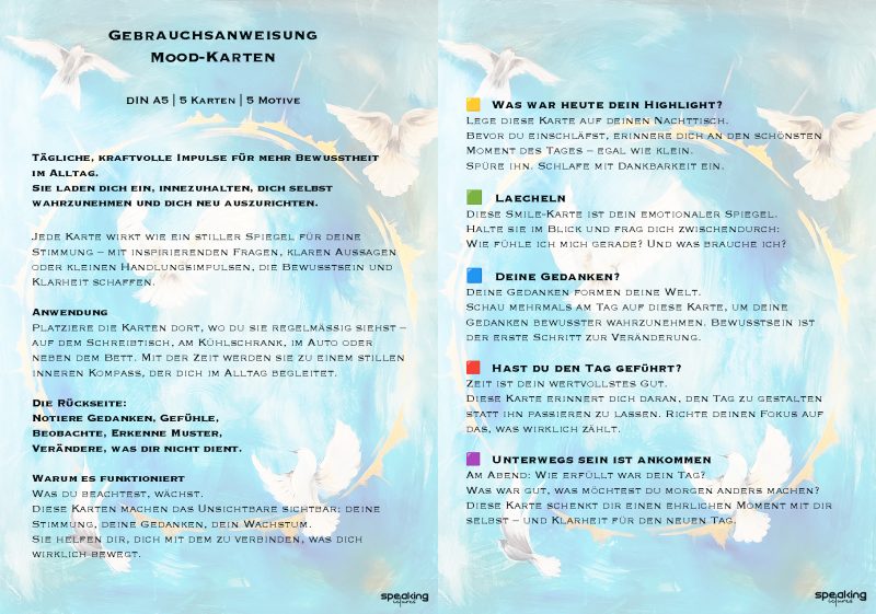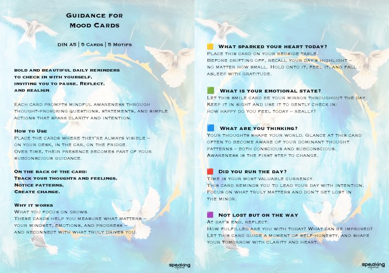 Ein täglicher Impuls für Achtsamkeit und Klarheit. Platziere die fünf Karten immer sichtbar. Nutze die Rückseite, um Gedanken und Gefühle zu reflektieren – so wächst Klarheit, Tag für Tag.