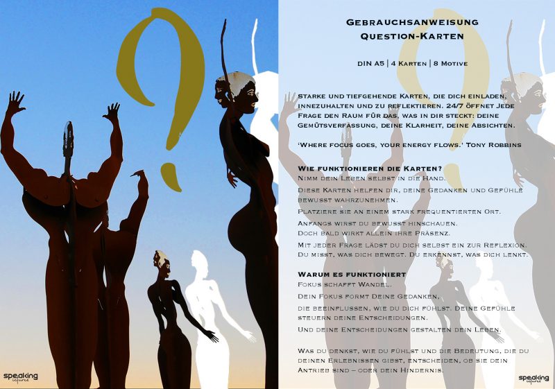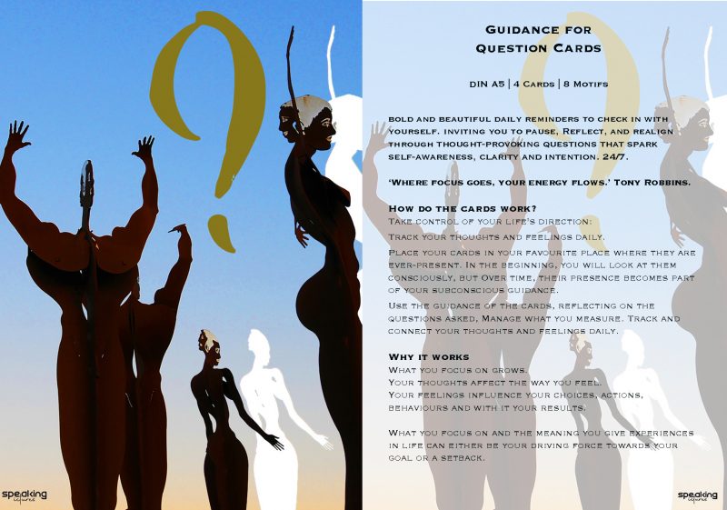 Acht einfache Fragen – mit tiefen Einsichten. Platziere die vier Karten dort, wo du sie täglich siehst. Ihre Präsenz erinnert dich daran, bei dir einzuchecken – und bewusst zu wachsen. Reflektiere & entwickle dich weiter. Dein Fokus formt deinen Weg. Mach ihn zu deinem.